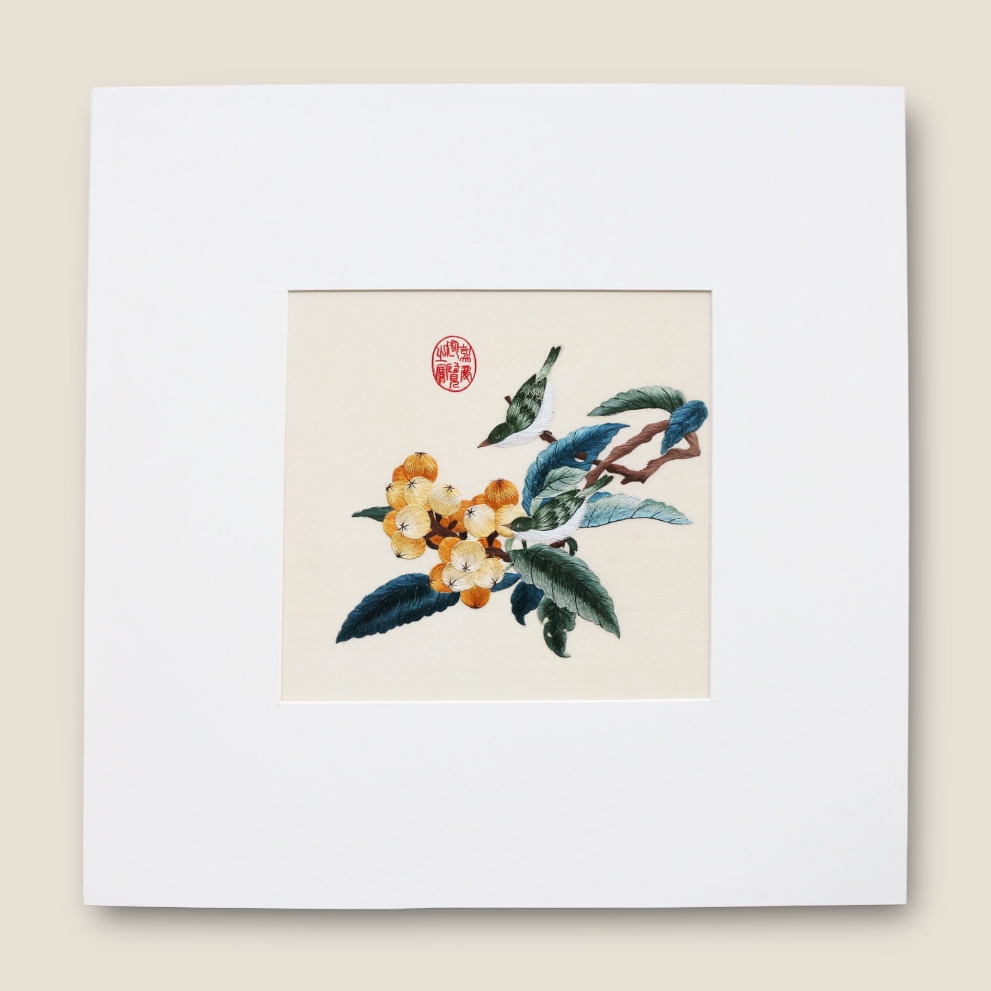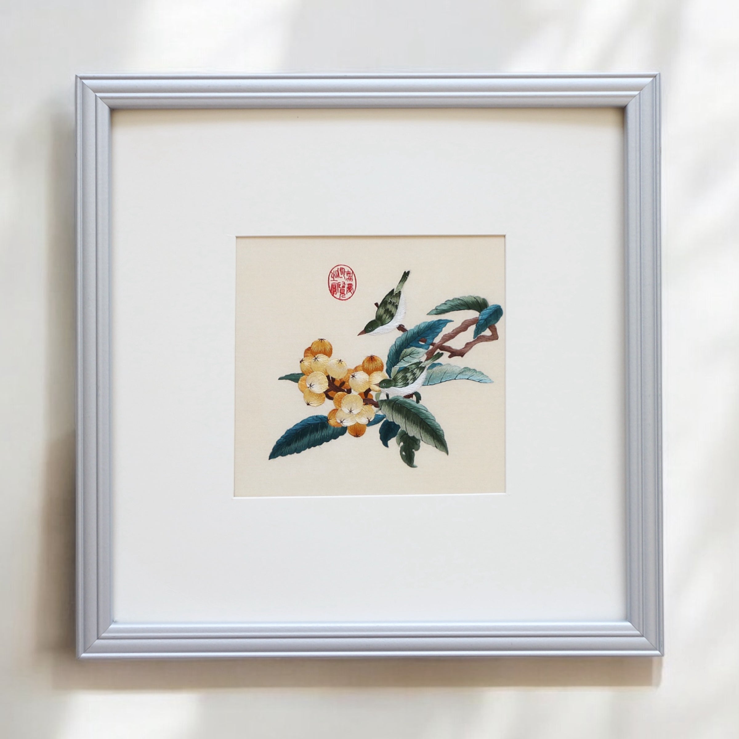 This elegant piece, "Loquat and Birds," depicts a pair of birds perched on a loquat tree, symbolising prosperity and harmony in traditional Chinese culture. Each stitch is expertly handcrafted, bringing to life the textured golden loquats, lush green leaves, and finely detailed birds.