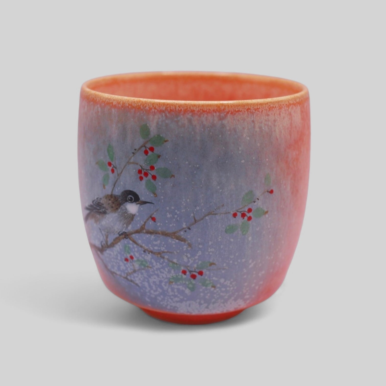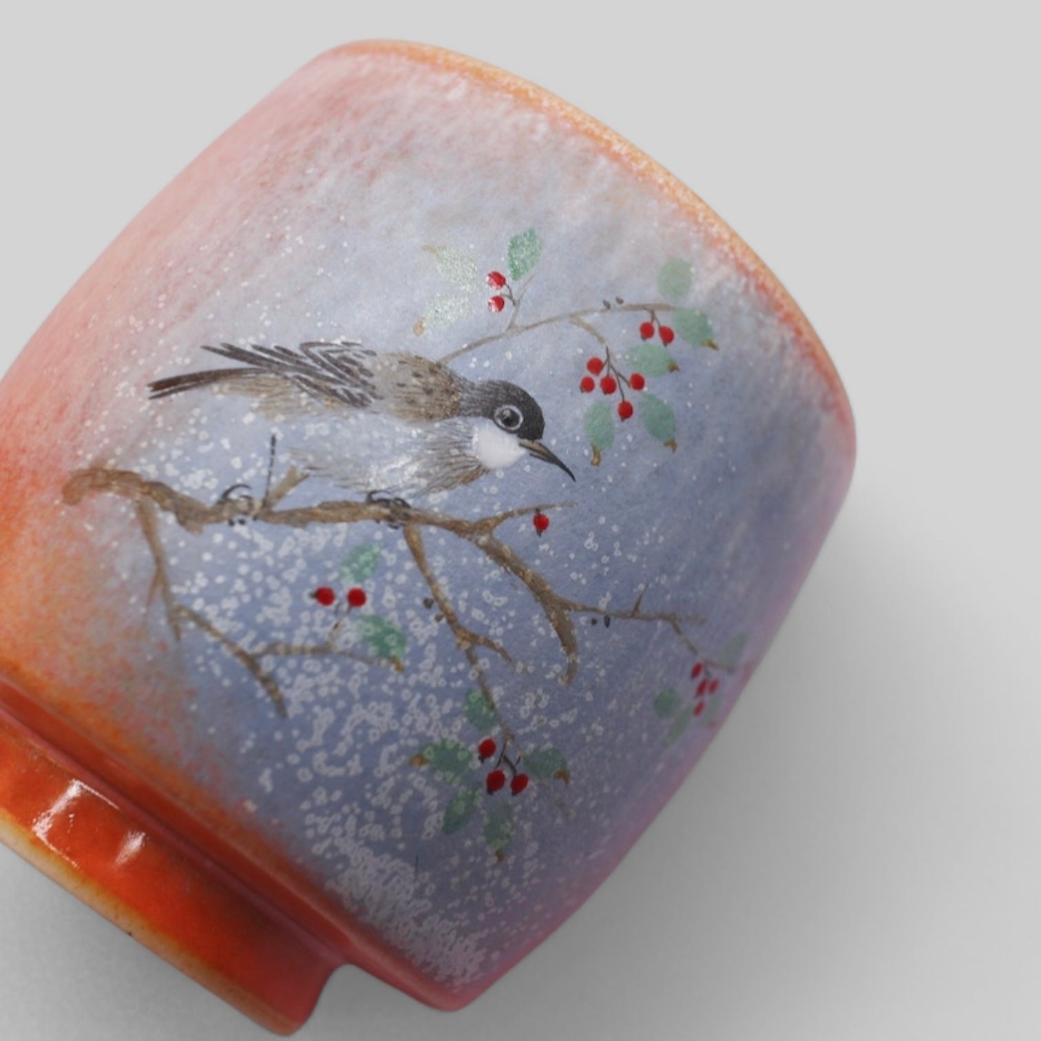 This exquisite 75ml ceramic tea cup captures the peaceful essence of winter. The hand-painted design features a delicate bird perched on a snow-covered branch adorned with red berries, evoking the quiet stillness of a winter's day.