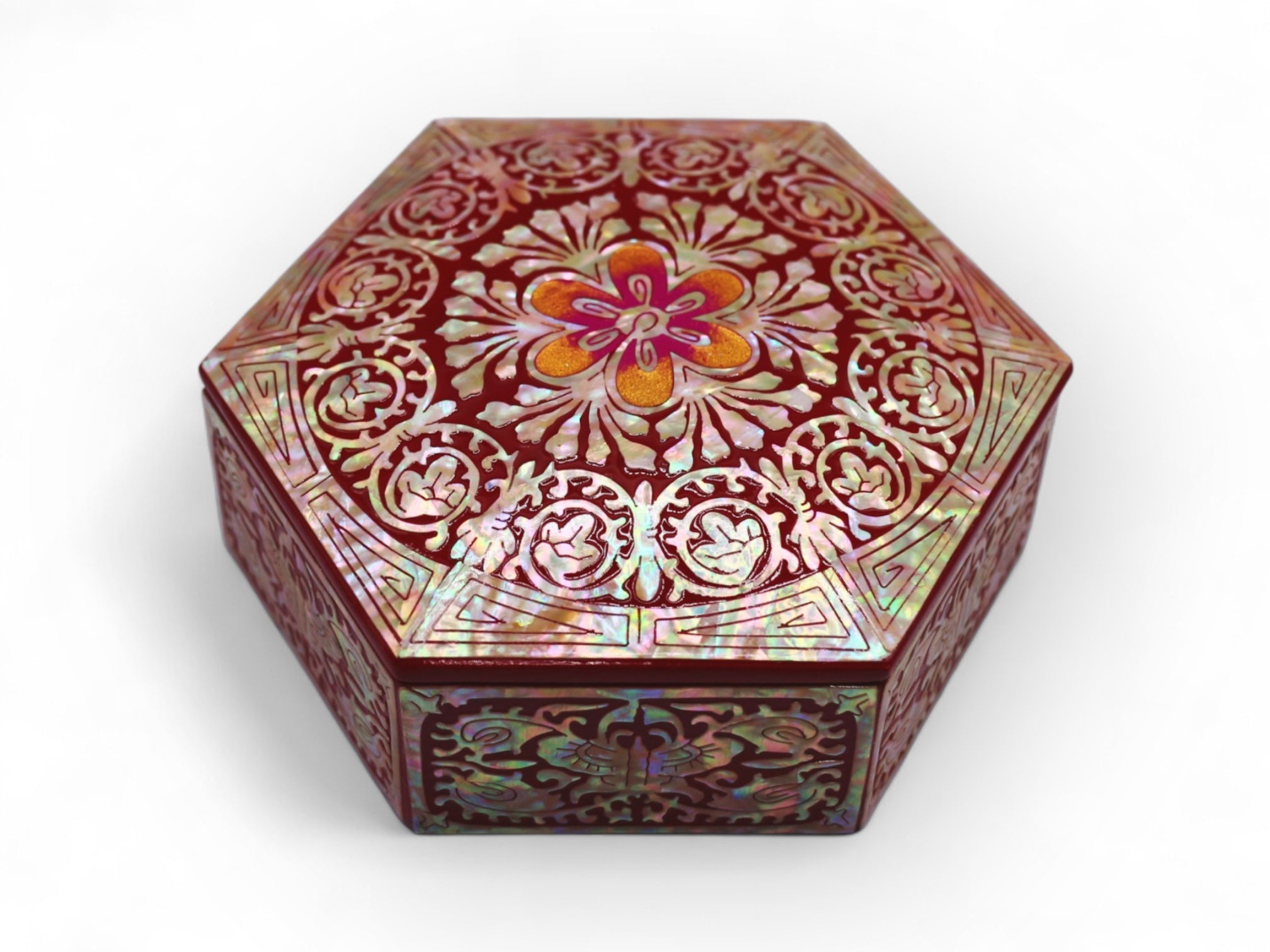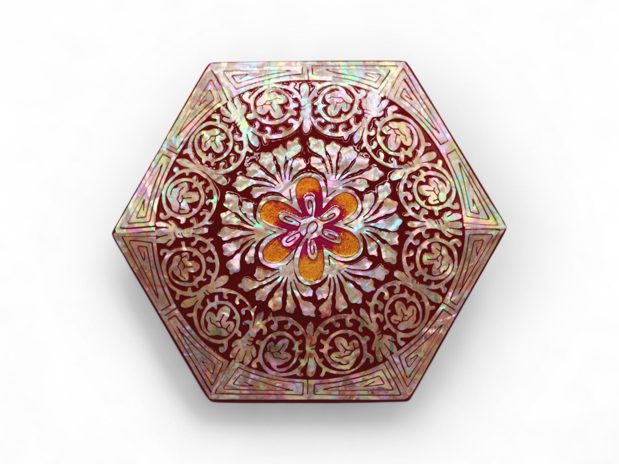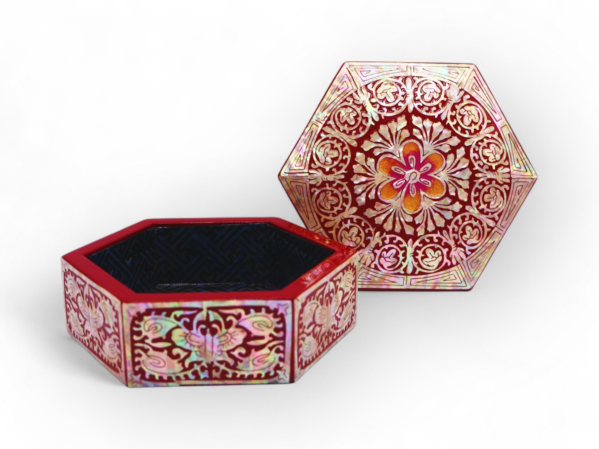 Handmade in Yangzhou, this hexagonal jewellery box is finished in a rich red natural lacquer and decorated with intricate mother-of-pearl inlay. Each iridescent floral motif is crafted from thin, hand-cut shell pieces and polished flush into the lacquer surface, creating a smooth, radiant finish. The interior reveals a contrasting geometric shell pattern, adding depth and artistry to this refined keepsake box.