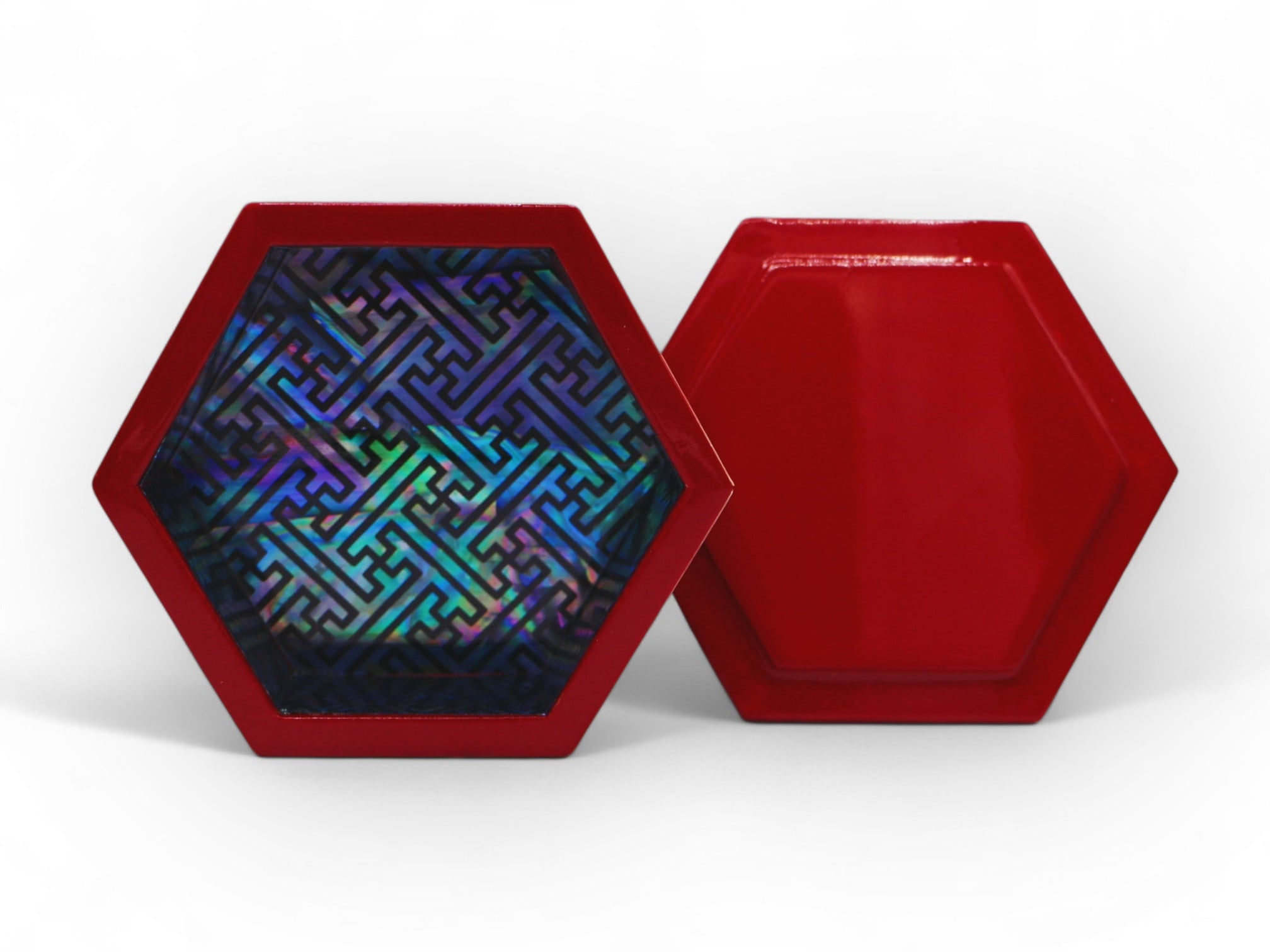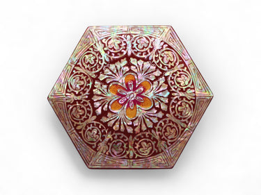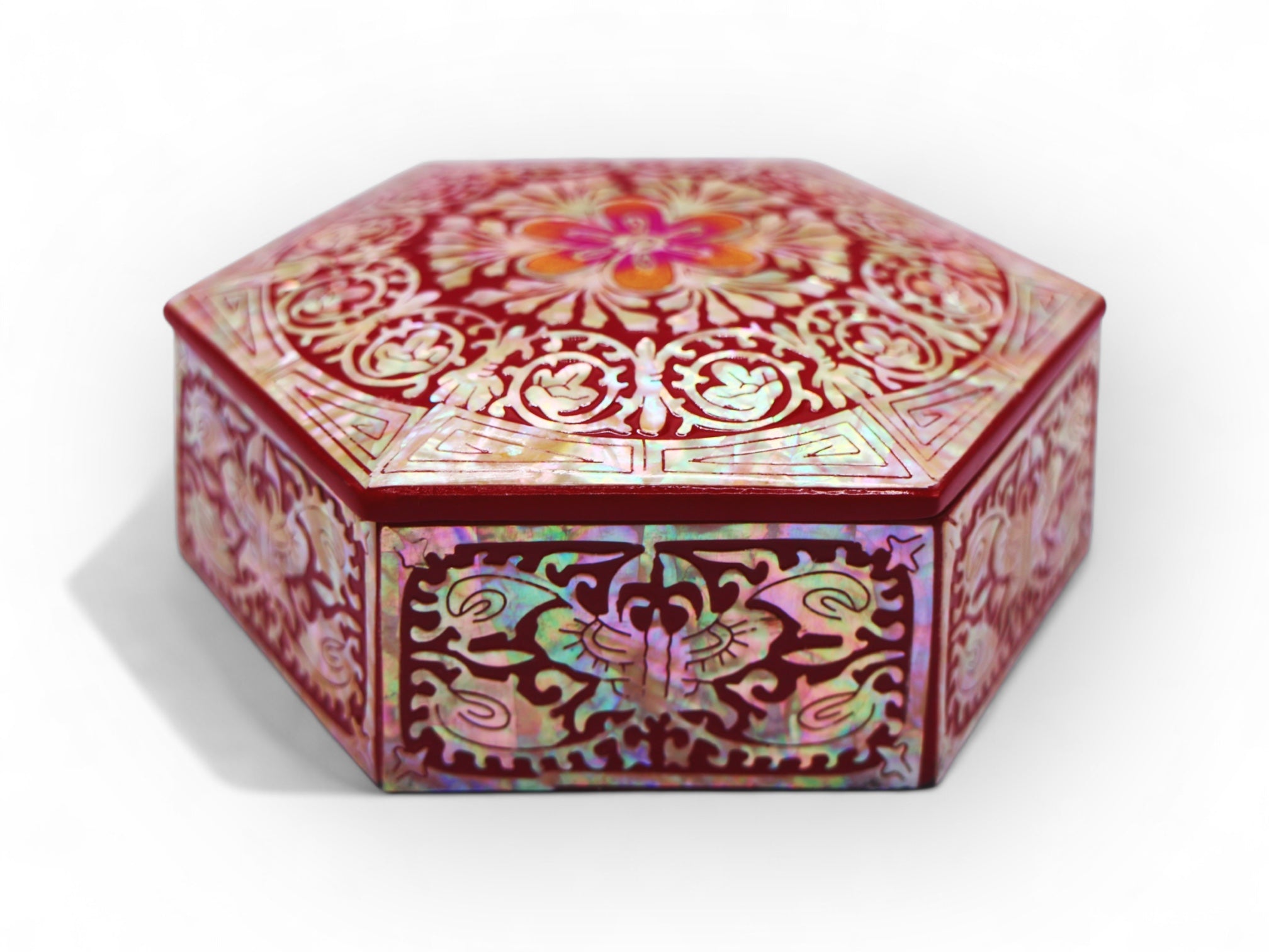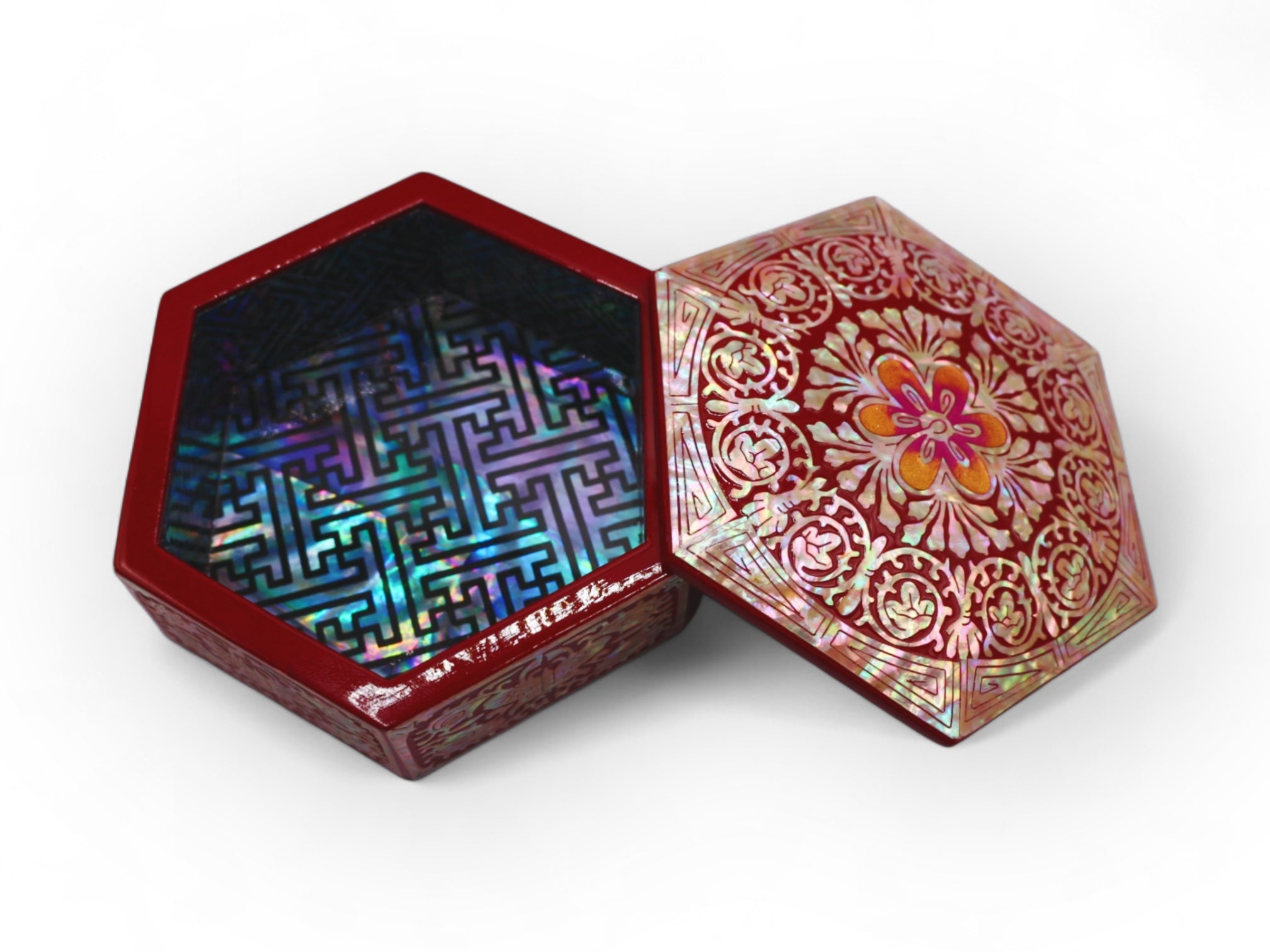 Handmade in Yangzhou, this hexagonal jewellery box is finished in a rich red natural lacquer and decorated with intricate mother-of-pearl inlay. Each iridescent floral motif is crafted from thin, hand-cut shell pieces and polished flush into the lacquer surface, creating a smooth, radiant finish. The interior reveals a contrasting geometric shell pattern, adding depth and artistry to this refined keepsake box.