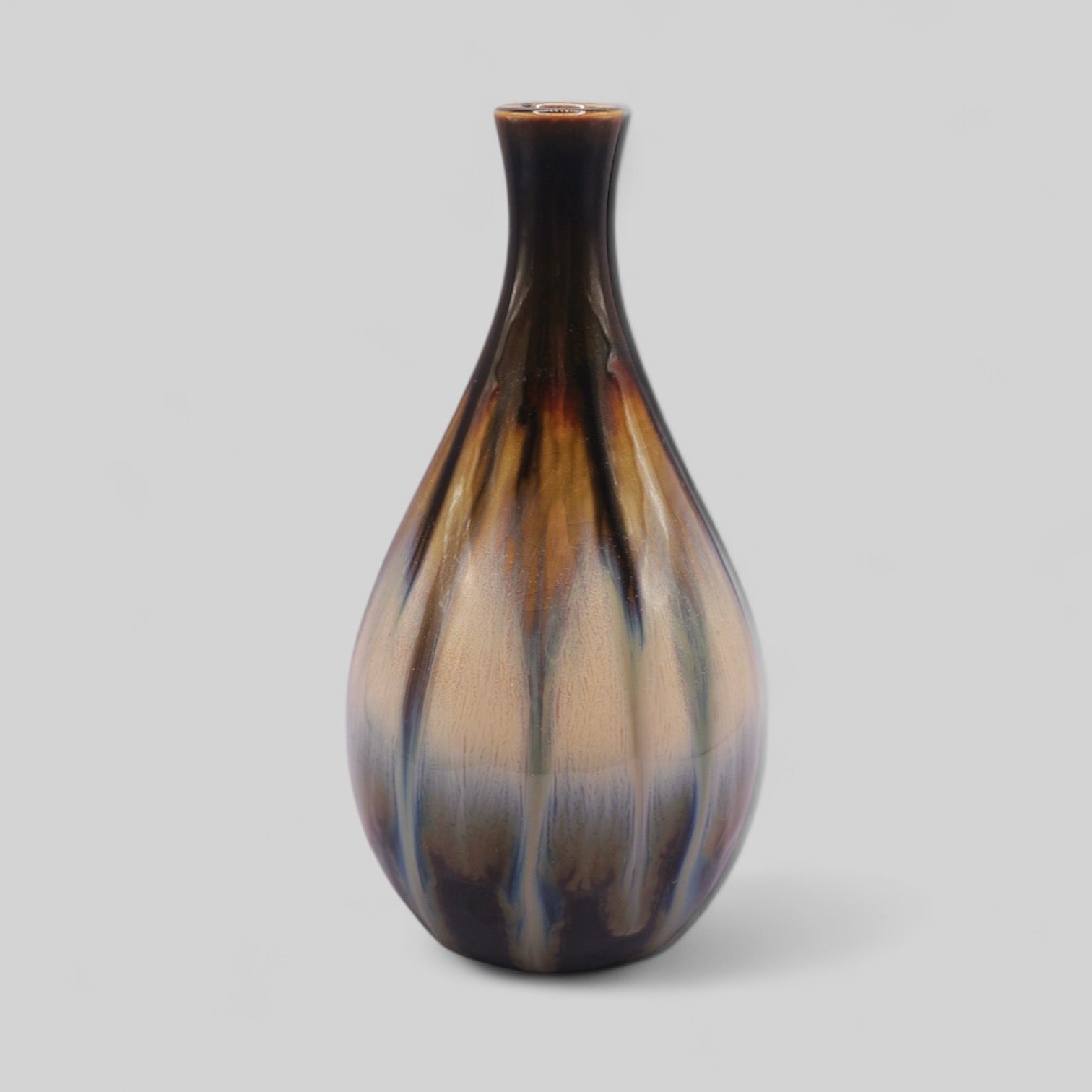 Standing at approximately 14 cm tall, this vase features a beautiful blend of warm amber, deep brown, and soft blue hues, evoking the image of cascading leaves in the golden light of autumn. The natural variations in the glaze create a flowing pattern that adds depth and character to each piece.