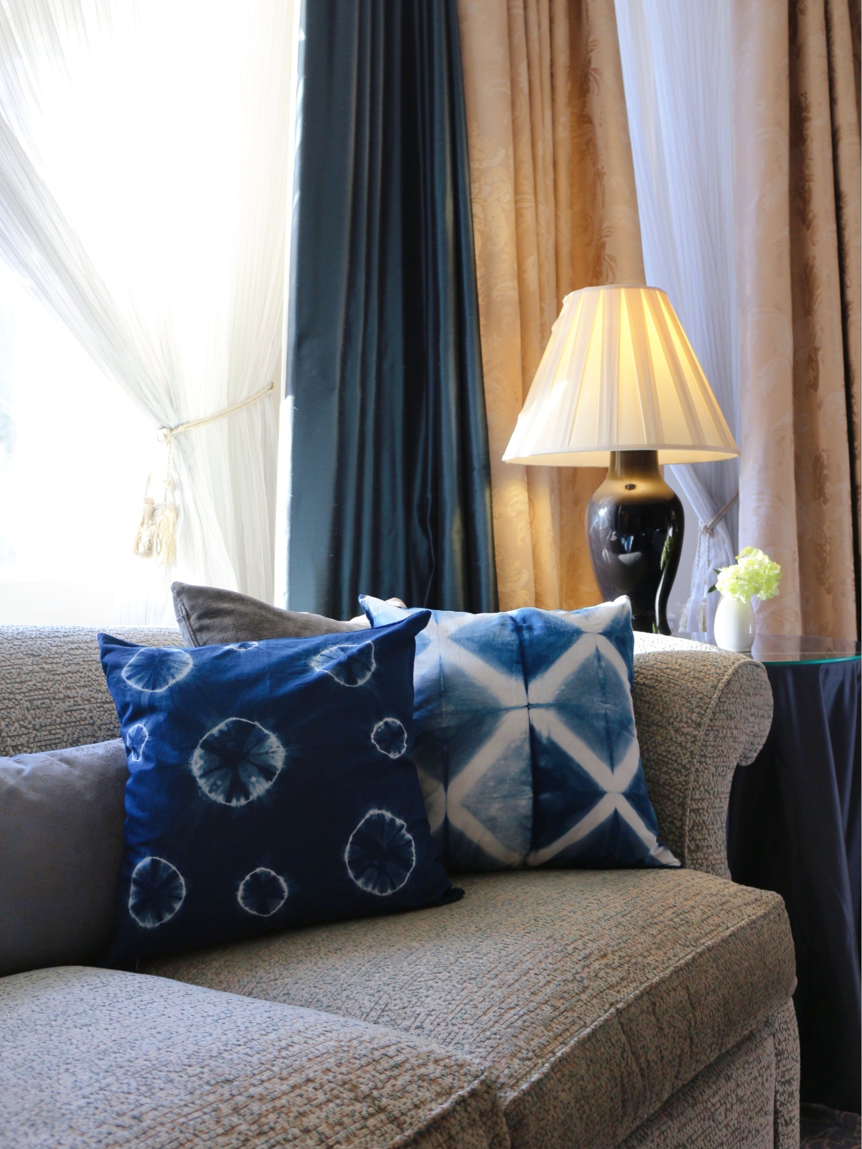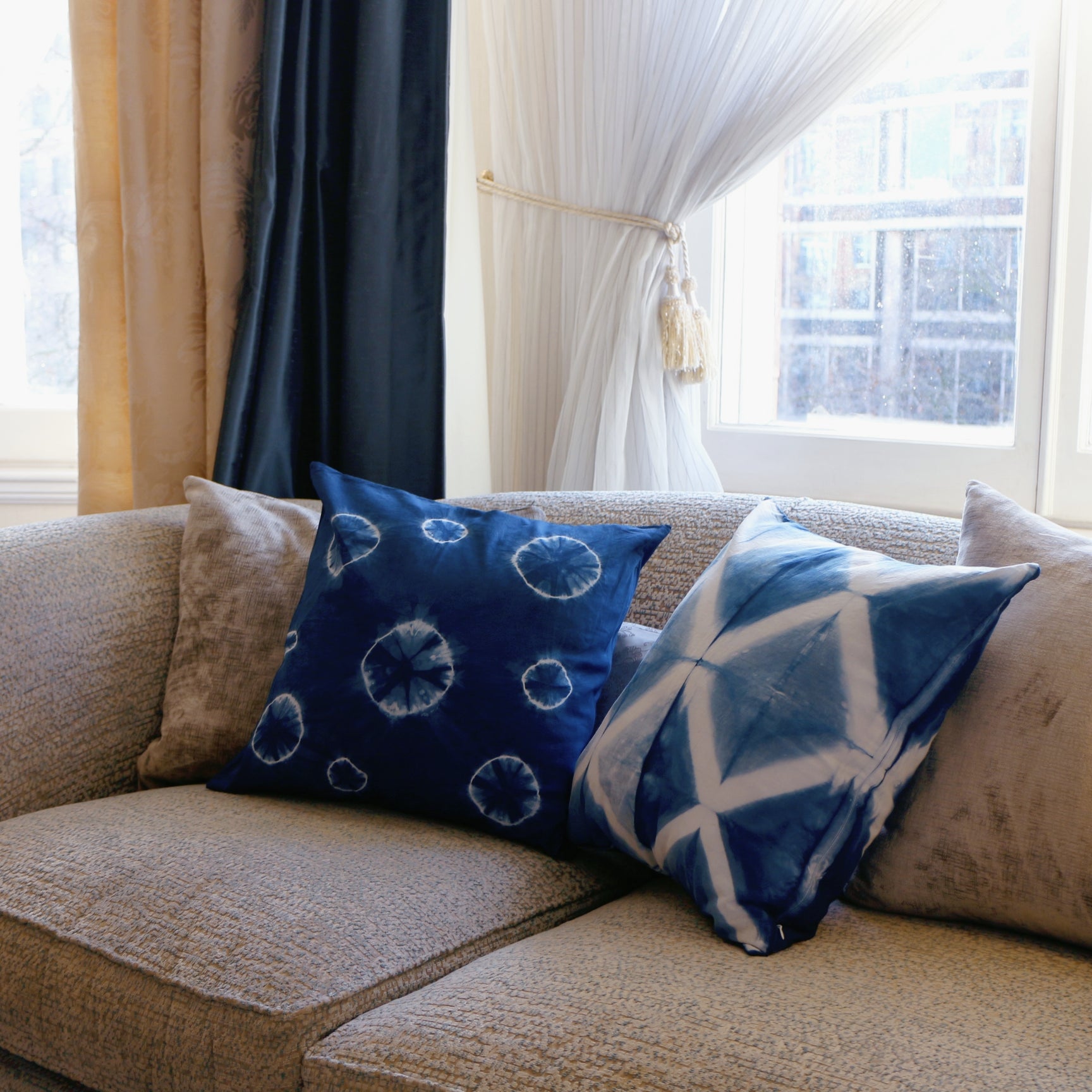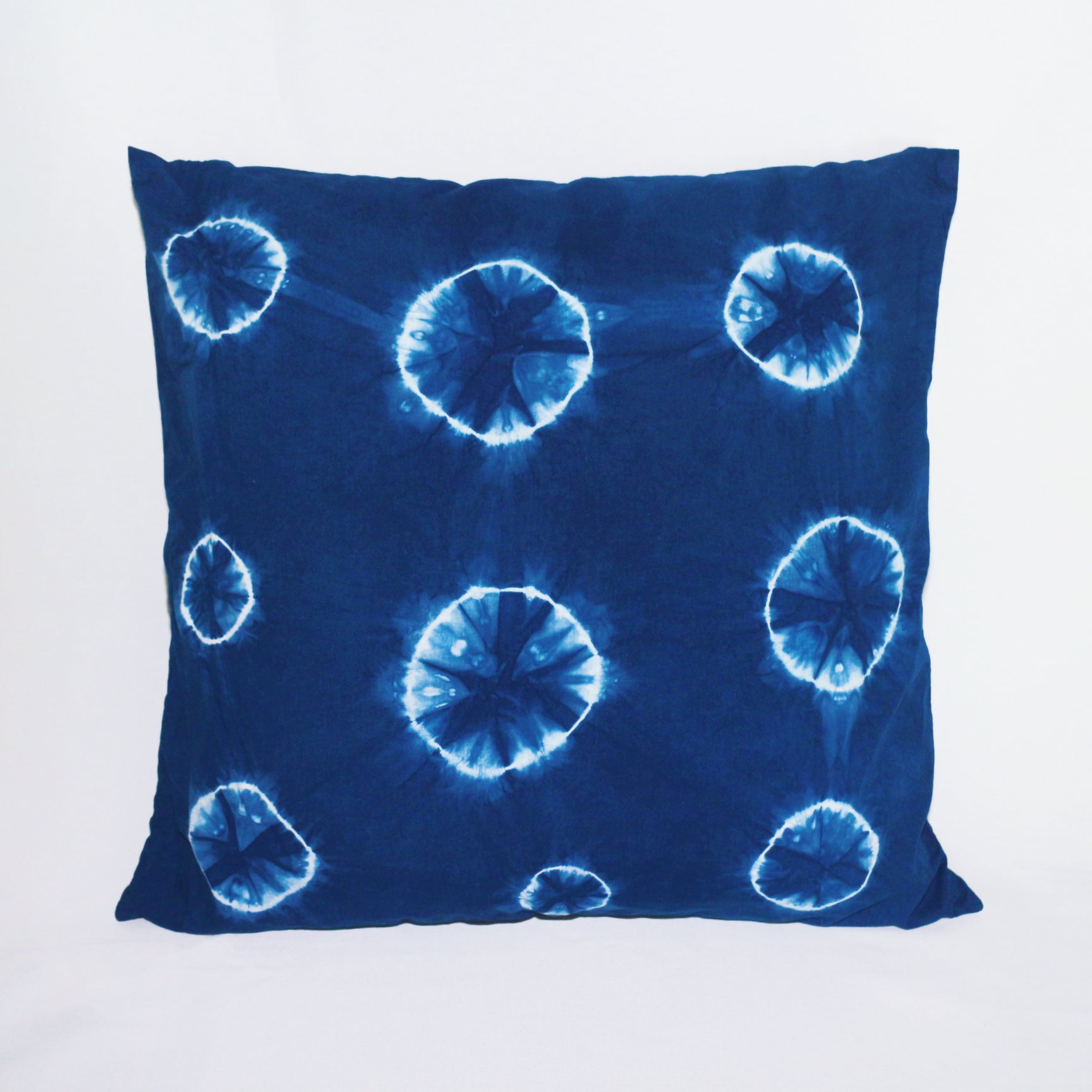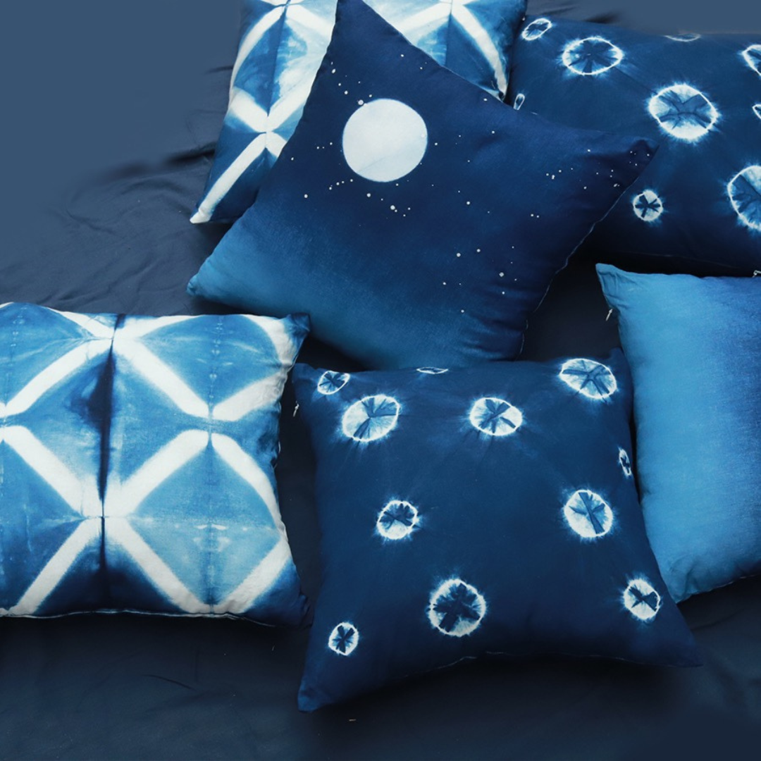 This collection of handcrafted tie-dyed cushions employs bluegrass as a natural dye, skilfully combining tie-dye and batik techniques to fashion diamond, bubble, and night sky patterns. Their colours are understated, with subtle variations in each pattern.