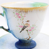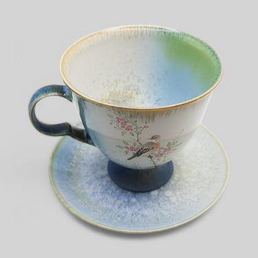 This elegant hand-painted ceramic cup set features a rosefinch perched on a blooming peach branch, inspired by traditional Chinese brush painting. The soft blue, green, and ivory glaze creates a serene, dreamlike effect, complemented by a gold-rimmed edge for added refinement.