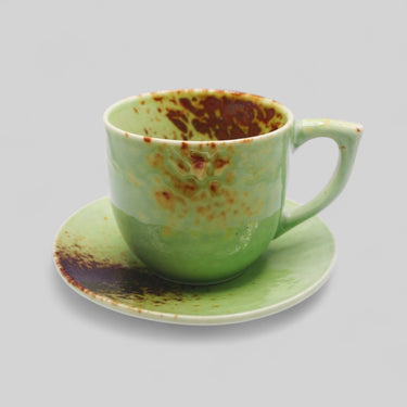 Enjoy the beauty of traditional Chinese craftsmanship with this handmade coffee cup set from Jingdezhen. The cup features a unique blend of earthy greens and warm browns, with natural variations in the glaze that give each piece its own charm.
