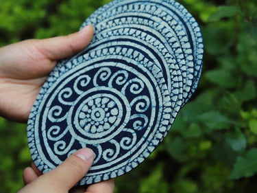 Introducing our collection of hand-painted round batik coasters, skillfully crafted by Miao artisans and dyed with natural indigo grass dyes. Each coaster is one-of-a-kind. Coaster diameter is 12 cm. Handcrafting may result in slight size differences.