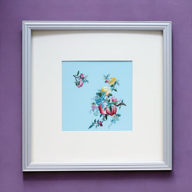 This stunning piece, "Prosperity Peaches," features a branch of ripened peaches surrounded by grapes, flowers and lush leaves, symbolising longevity and vitality in traditional Chinese culture.