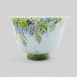 This exquisite porcelain tea cup is handcrafted in Jingdezhen, the historic heart of Chinese ceramics. It features a beautifully rendered goldfish beneath cascading wisteria, meticulously painted using traditional underglaze colouring techniques—celebrated for both their subtlety and lasting beauty.