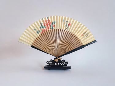 The fan is packaged in a brocade box and includes a wooden fan stand for display. They are perfect as collectible gifts.