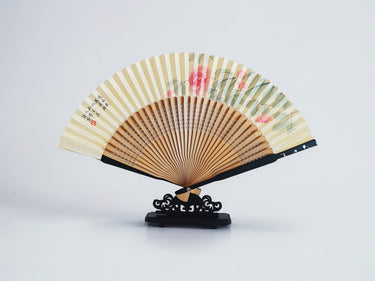 The fan is packaged in a brocade box and includes a wooden fan stand for display. They are perfect as collectible gifts.