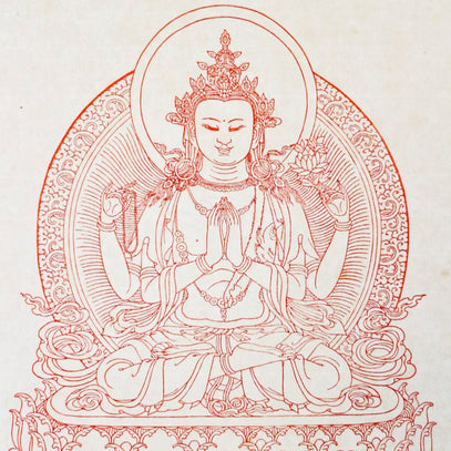 This woodblock print is a reproduction of a Ming dynasty image of the Four-Armed Avalokiteśvara (Guanyin), shown seated in lotus position with symbolic gestures and objects representing compassion and wisdom.
