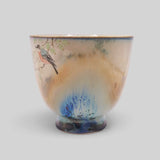 This hand-painted ceramic tea cup, crafted by artisans in Jingdezhen, features a peaceful bird perched on a branch with soft, earthy tones and gentle blues. The colours reflect the calm beauty of a morning sky.