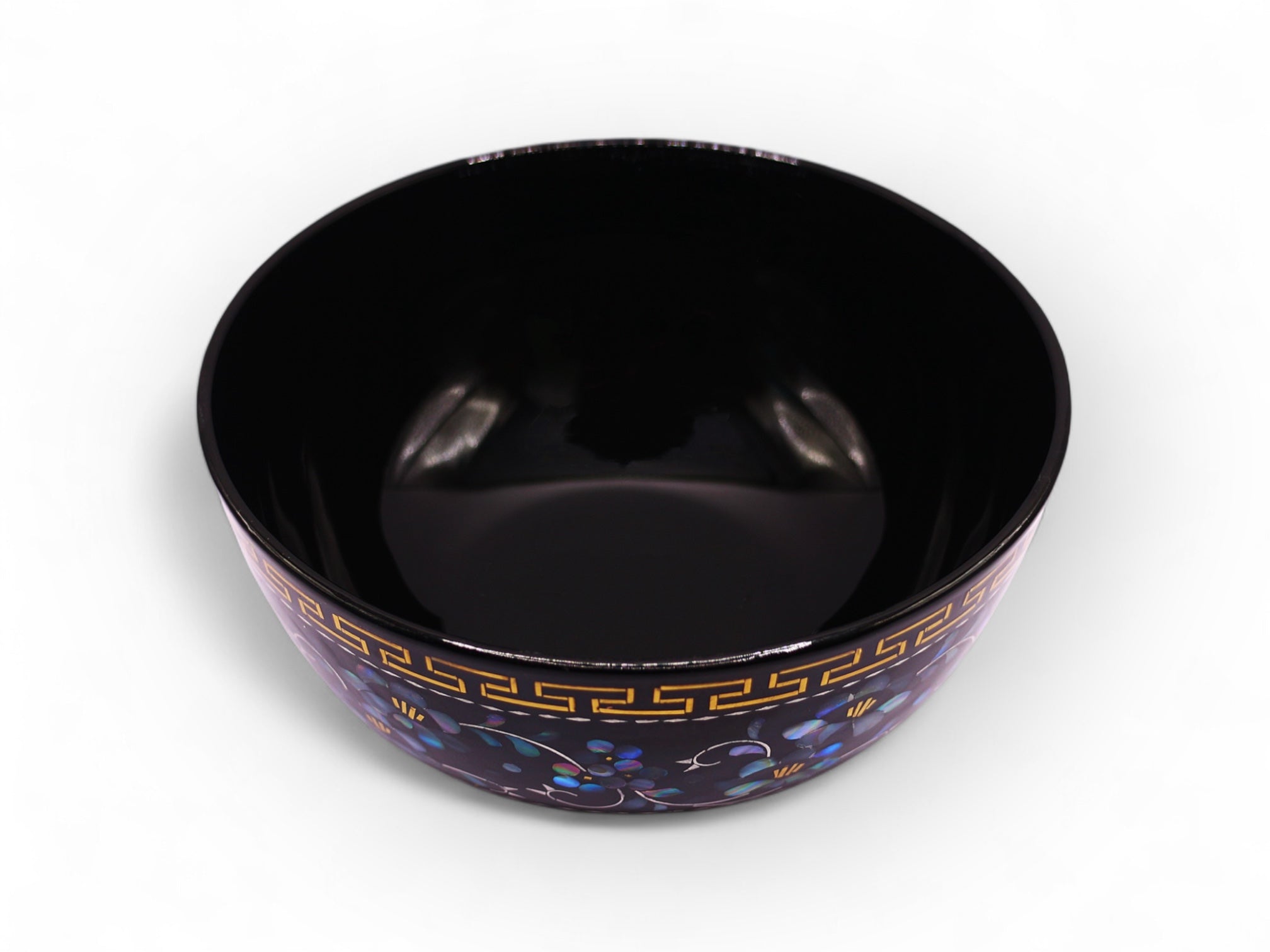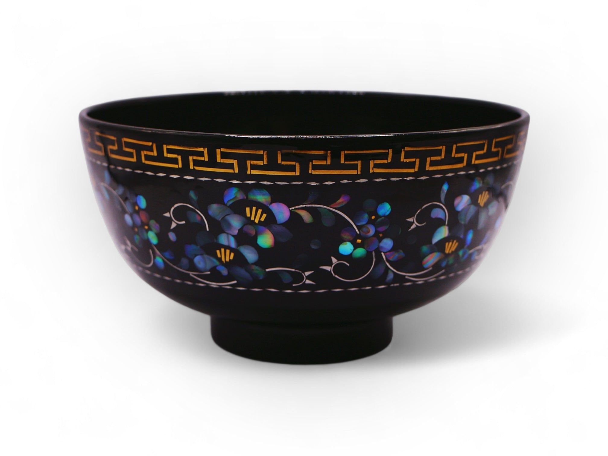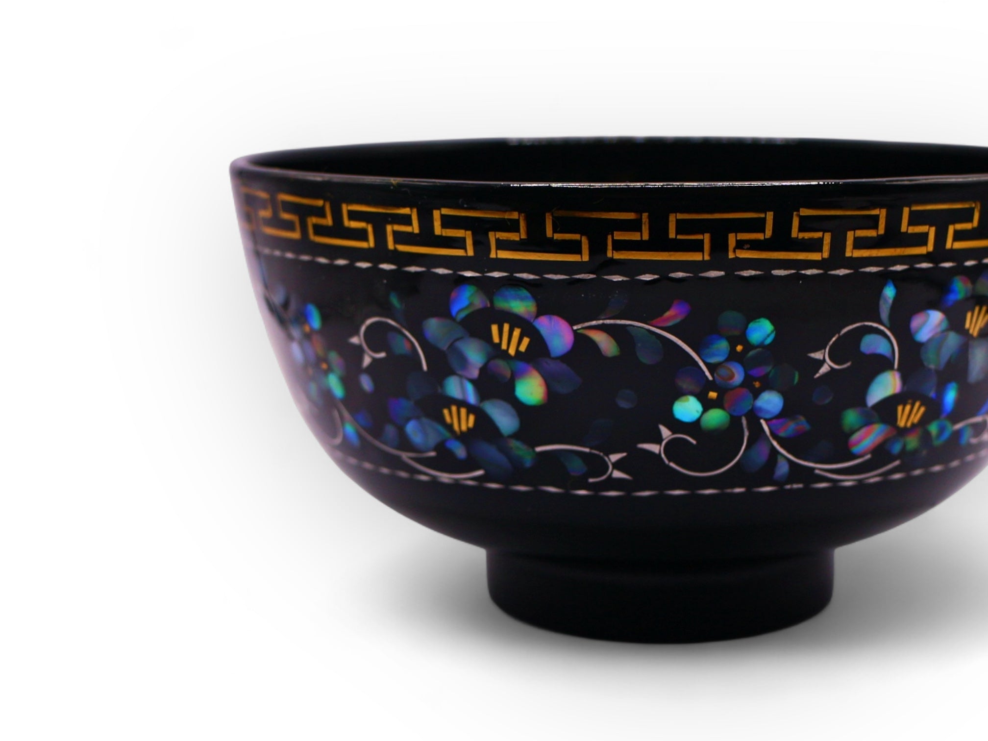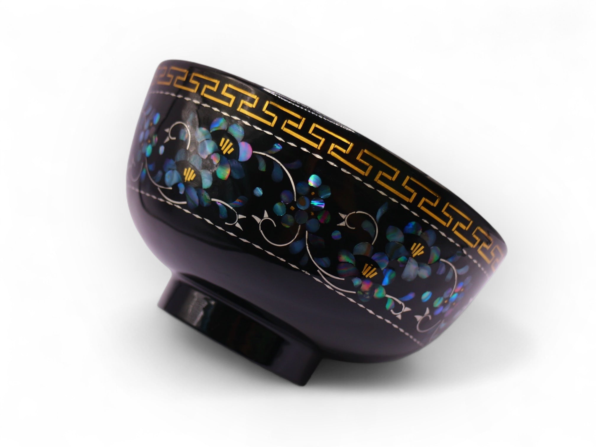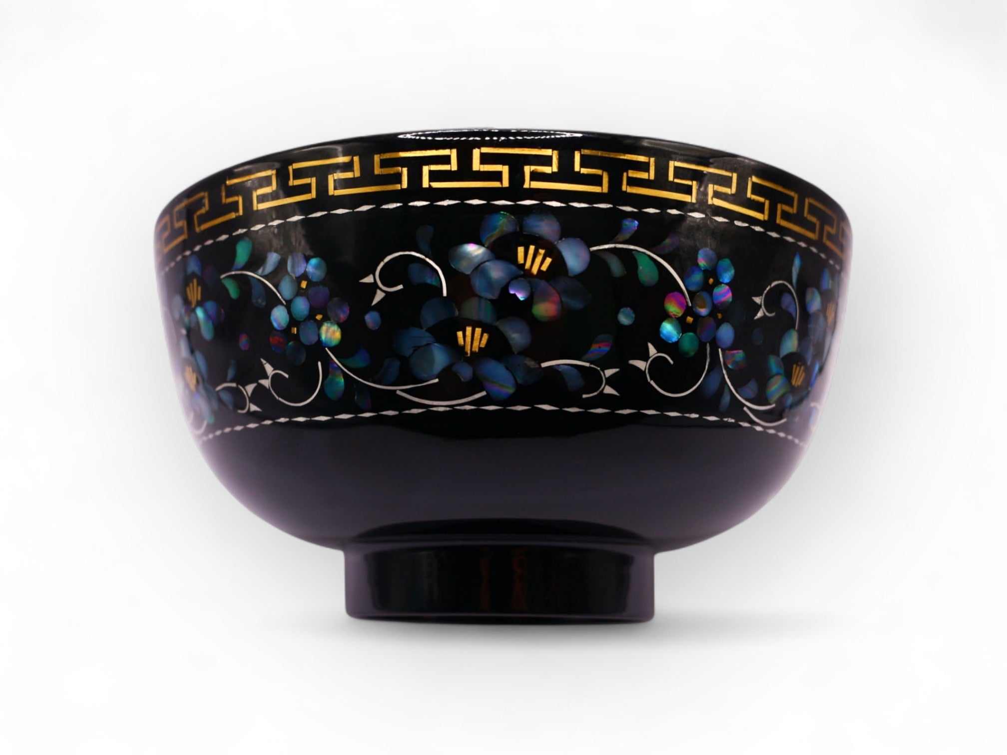 Handcrafted in Yangzhou using layered natural lacquer and refined mother-of-pearl inlay, this bowl features a deep, mirror-black finish with soft iridescence. Each shell and mica motif is cut by hand and polished flush into the surface, creating a smooth, jewel-like sheen.