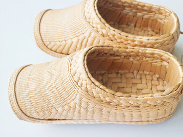 This is an exquisite pair of collectible hand-plaited straw shoes, a symbol of traditional craftsmanship and enduring heritage.