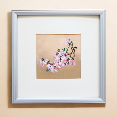 Each stitch is meticulously handcrafted, using fine silk threads blended seamlessly to create a realistic, three-dimensional effect. The delicate petals, natural colour gradients, and intricate branch details bring depth and movement to the artwork.