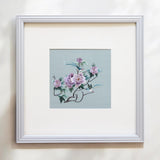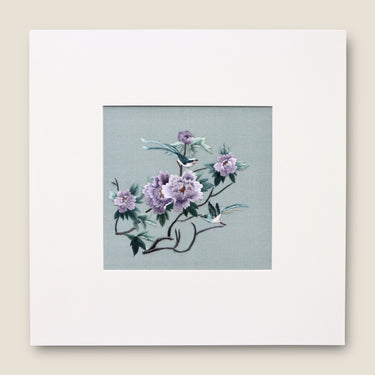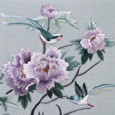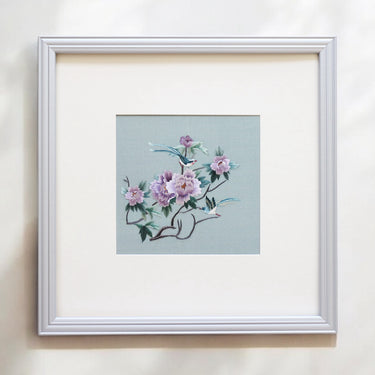 This elegant piece, "Purple Peonies and Birds," captures blooming purple peonies intertwined with gracefully soaring birds. Each stitch is meticulously handcrafted, bringing to life the soft, layered petals of the peonies and the delicate wings of the birds.
