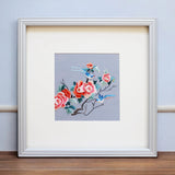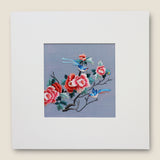 This stunning piece, "Red Peonies and Bluebirds," showcases vibrant red peonies in full bloom, accompanied by elegantly detailed bluebirds.