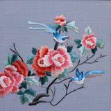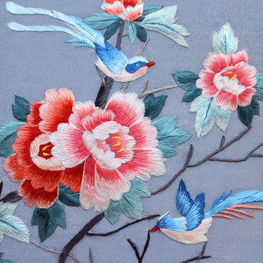 Each stitch is meticulously handcrafted, creating smooth colour transitions and a lifelike three-dimensional effect. The dynamic composition of graceful bluebirds in flight and lush peonies brings a sense of movement and vitality to this artwork.